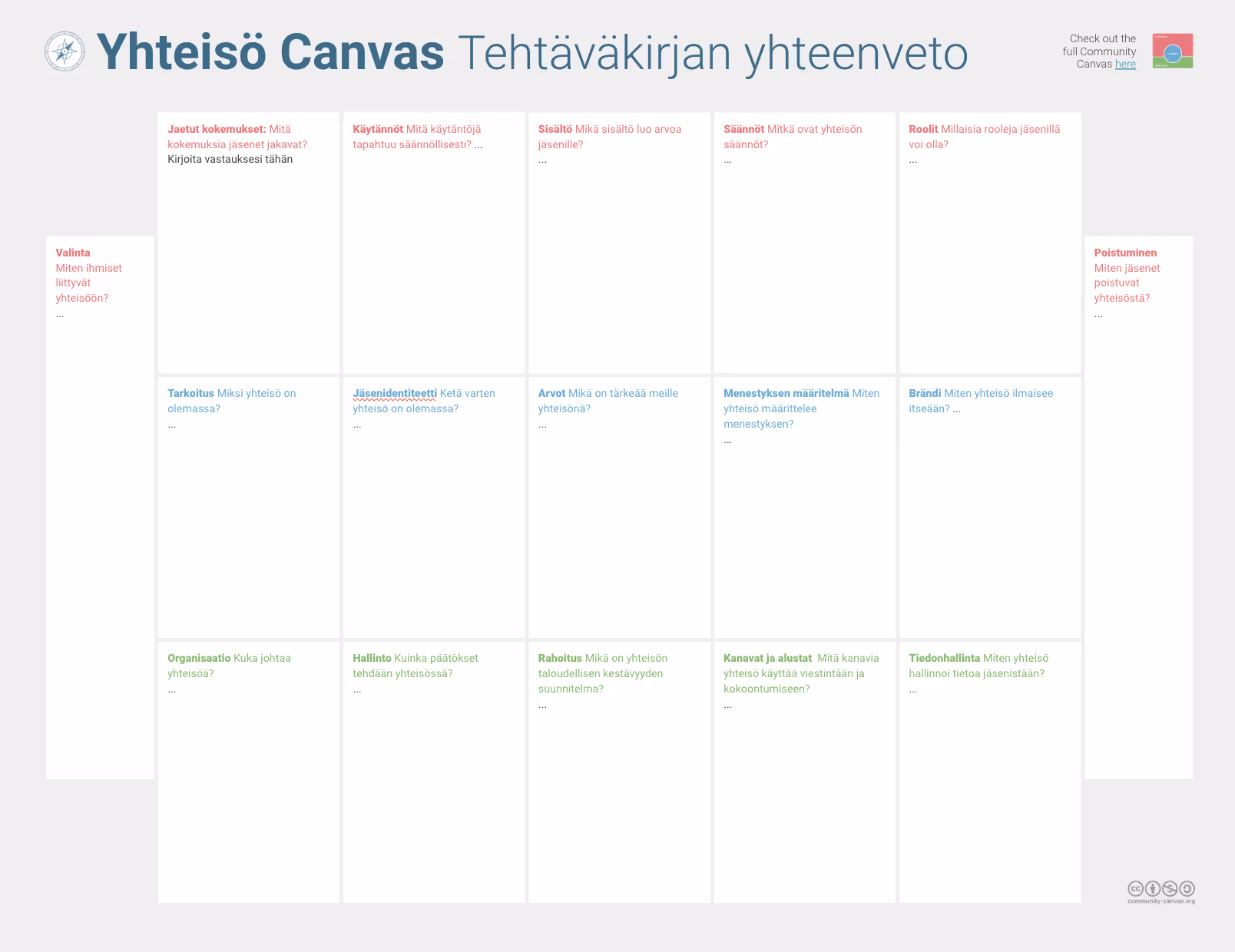 We worked together with a wonderful team of volunteers to translate the canvas. Here you can find all translations. Want to translate it into your language? Find out more here. The translated Community Canvas is published under the same creative commons license as the English Canvas, more info on that here.